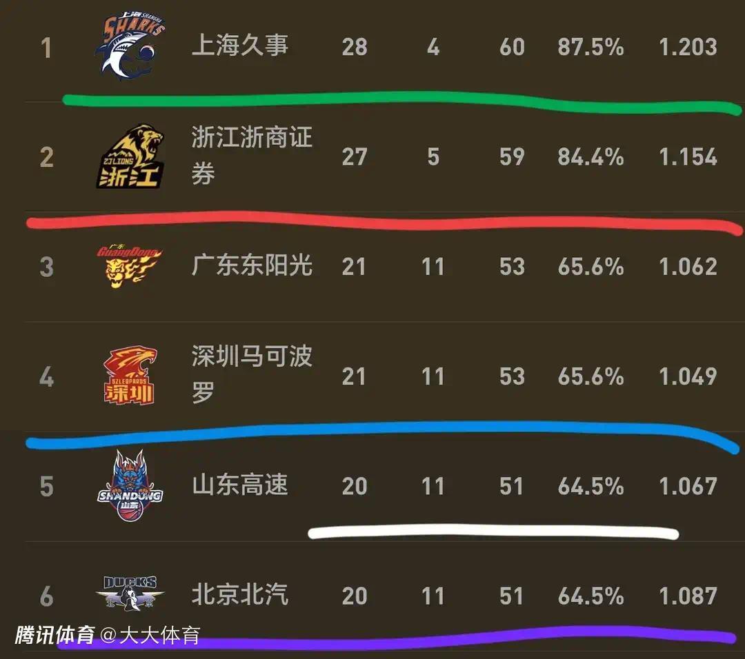 不过,上海和广厦的积分比第三、四名高出许多,广东和深圳是很难追上的。因此,不出意外的话,前二之争就是上海和广厦。