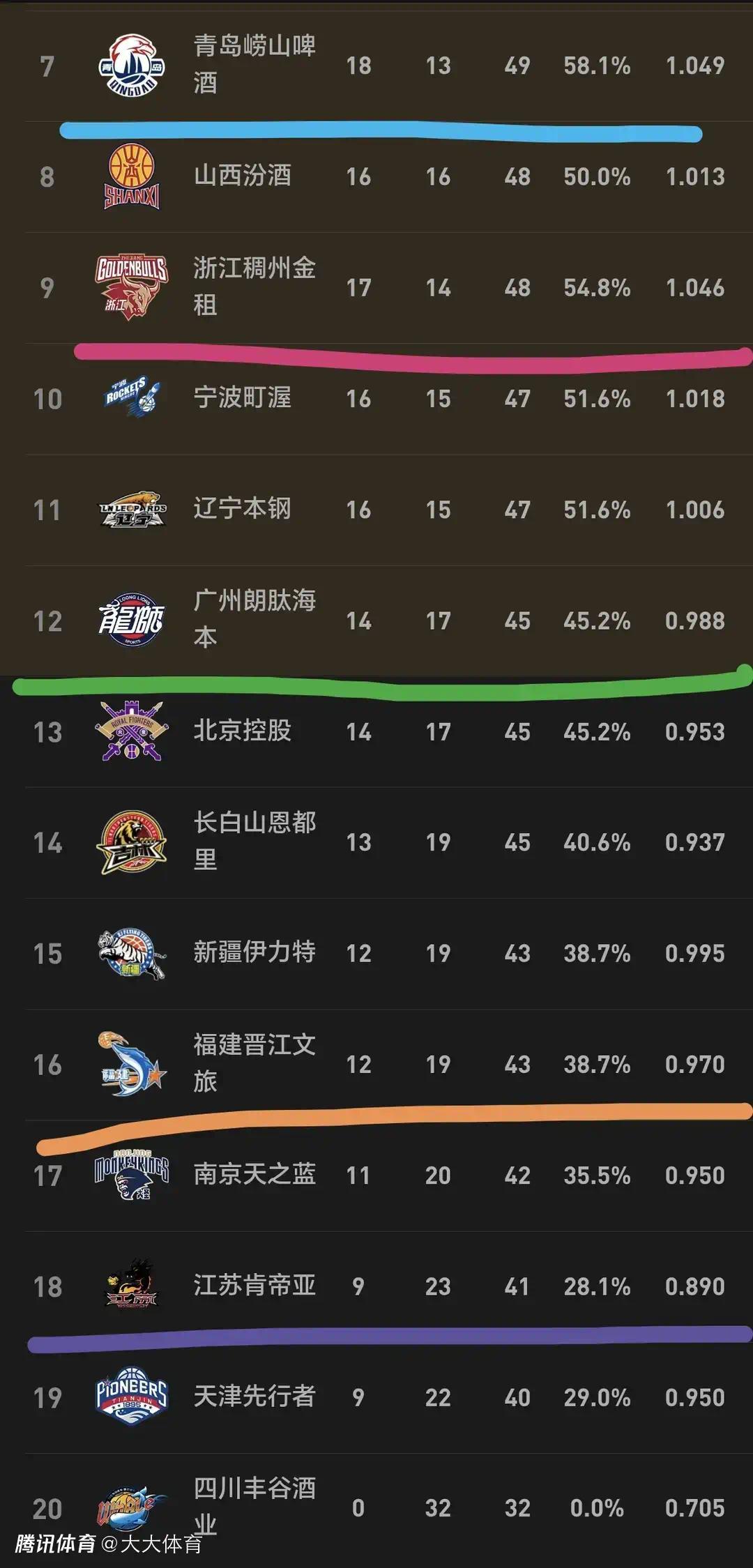 青岛第7、山西第8、浙江第9、宁波第10、辽宁第11、广州第12、北控第13、吉林第14、新疆第15、福建第16、同曦第17、江苏第18、天津第19、四川第20。